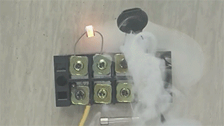 視頻1:回路中加電1000V,20A時(shí),15A的保險(xiǎn)絲無法動作,壓敏起 火燃燒。