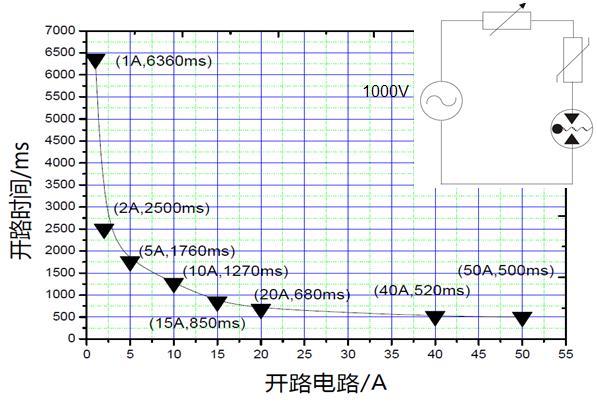 開路失效氣體放電管可以滿足這三點(diǎn)性能,且可以在工頻過來時(shí)很快切斷電路,如下圖為開路失效氣體放電管的工頻電流和斷開時(shí)間測試曲線: